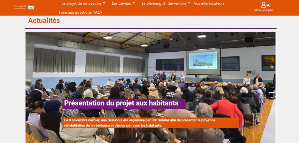 ICF Habitat Sud-Est Méditerranée fait appel à iD City pour communiquer sur les travaux de réhabilitation ayant lieu au sein des résidences à sa charge. Ces plateformes permettent de retrouver toutes les informations concernant les travaux réalisés, le planning des opérations et toutes les modalités pratiques d’organisation.